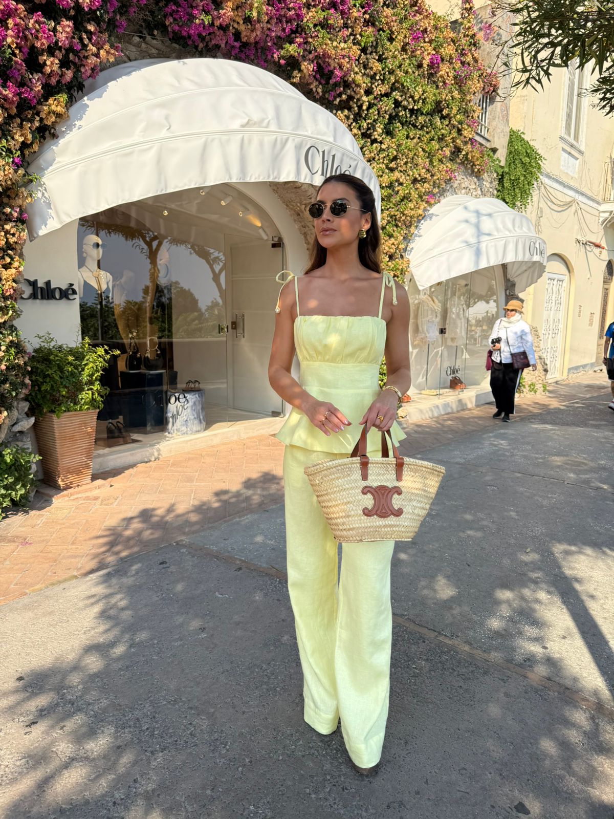 Com a essência do verão, traz blusa no mood peplum e calça reta.