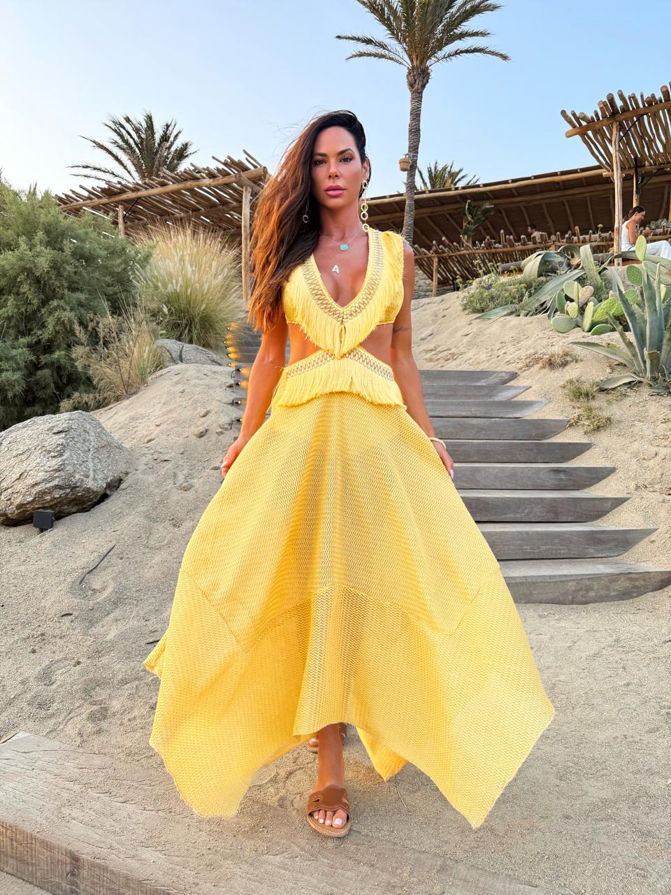Adornado com franjas de macramê no decote e no quadril, a peça ganha um toque artesanal e exclusivo, com acabamento hand-made que adiciona personalidade e charme. A modelagem possui recortes estratégicos na cintura, valorizando a silhueta, enquanto a saia com trama aberta cria um efeito fluido e leve.